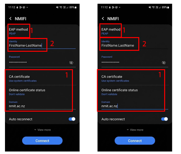 (1) Please enter the connection settings if not already selected as below. Your choices for the CA certificate may also show as "Do not Validate" or "Do not check" depending on your device